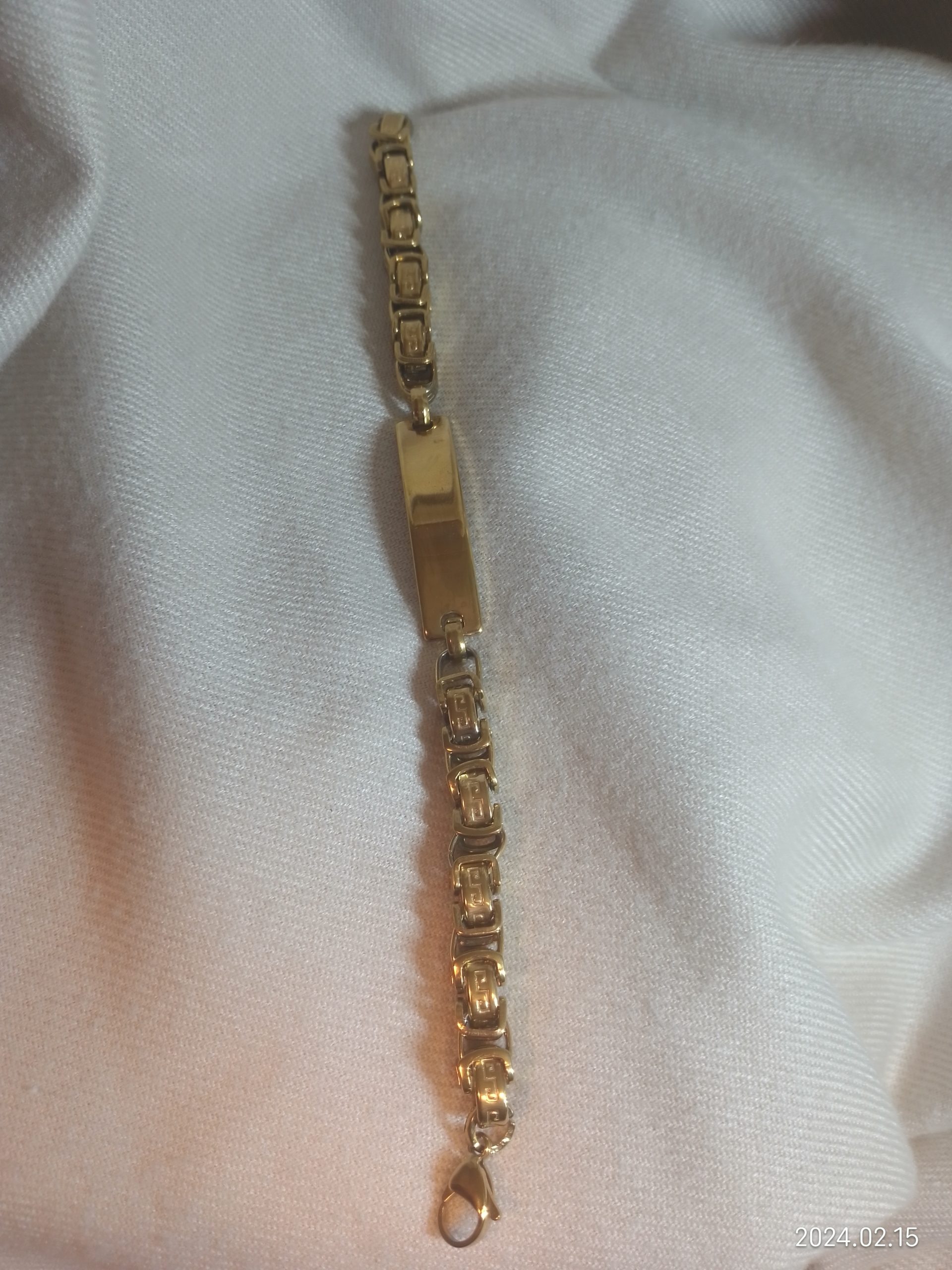 Elegante pulsera de acero en color dorado con eslabones, la cual lleva un enganche para cerrarla.